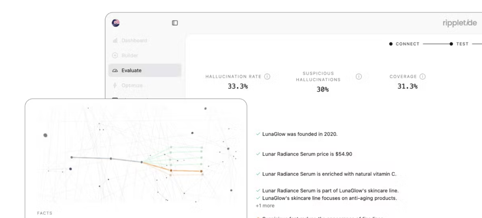 Rippletide Eval CLI is a terminal tool for beating on your AI agents until you actually trust them. It hits your agent endpoints from the CLI, auto generates questions from their own knowledge, lets you plug in fixed test sets, and spits out clear hallucination KPIs with real-time progress and detailed reports.