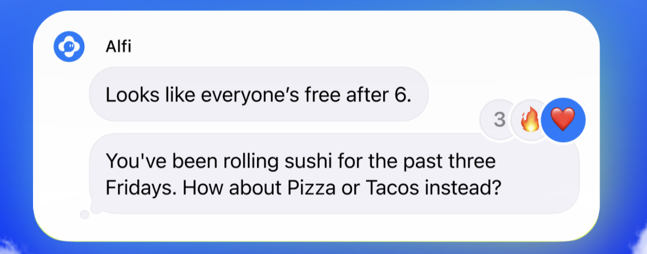 Alfi is a group chat app with an AI tucked inside the thread. It remembers the stuff people say they want to do, suggests spots via Yelp, nudges the group toward actual times, and keeps a shared calendar so plans do not vanish in the scroll. It also does the fun extras like goofy group images and a yearly wrap of who never stops talking.