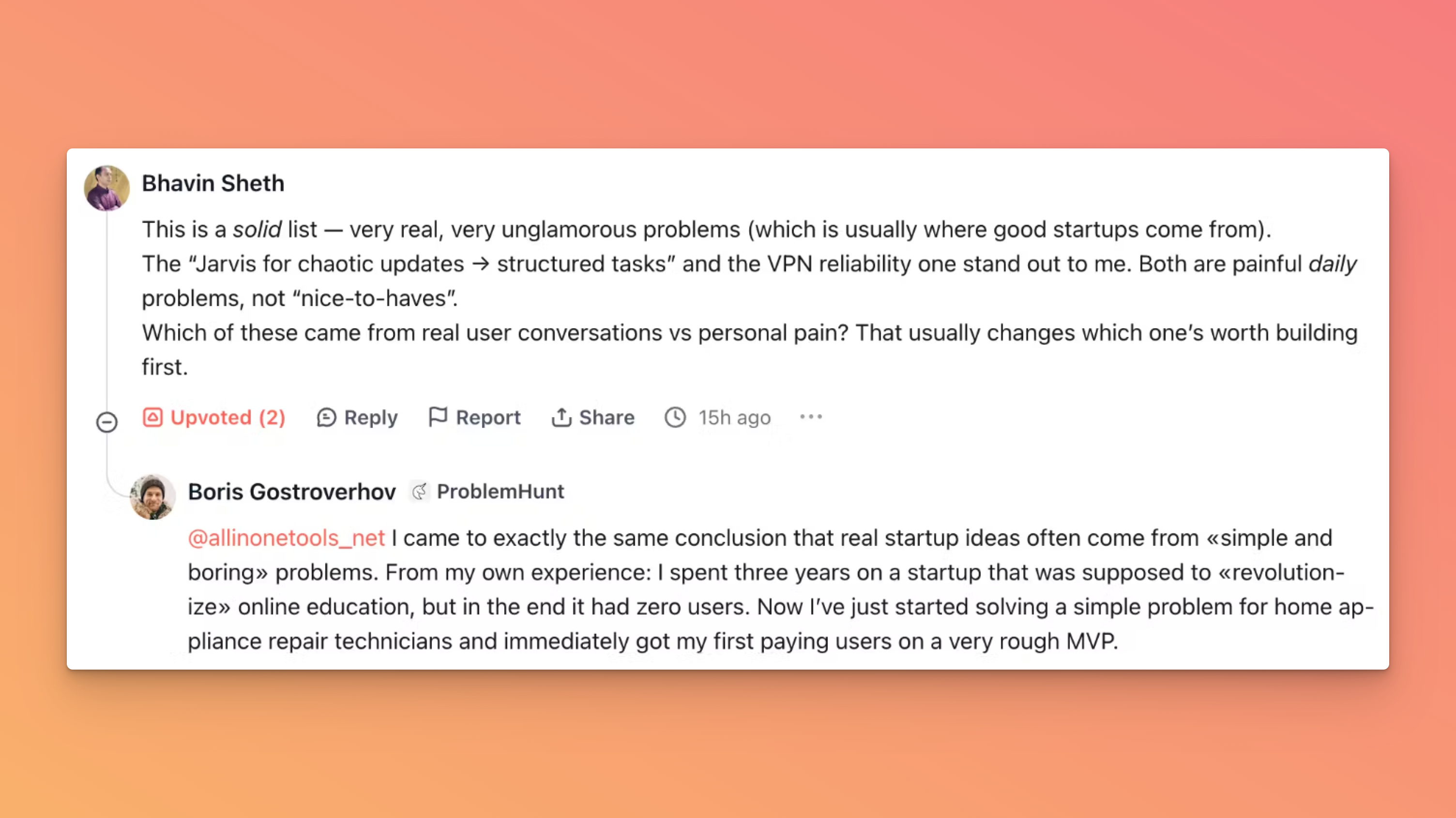 Boris started a thread asking if the best startups actually come from “boring” problems. He shares his own whiplash: three years chasing a big idea in online education that went nowhere, then immediate paying users when he built a simple tool for home appliance repair techs.