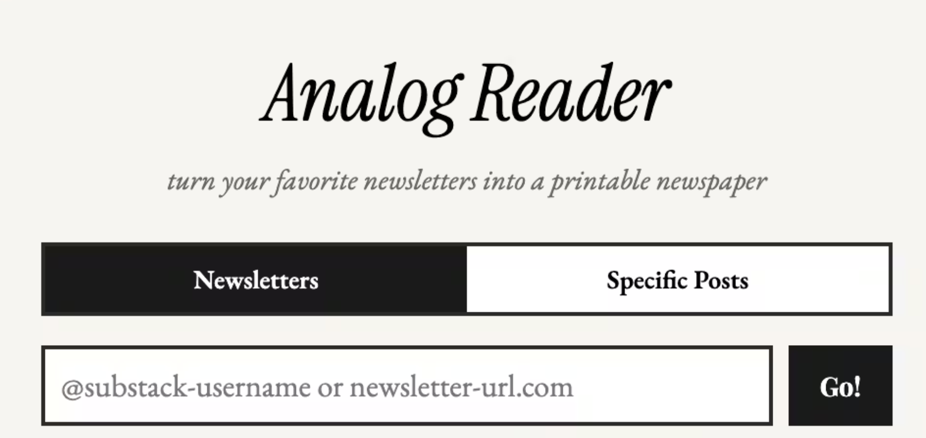 Analog Reader turns your favorite Substack, Ghost, and RSS newsletters into a printable newspaper. You pick what you want to read for the week, it bundles everything into a clean PDF, and you print it or send it to something like a reMarkable so you can actually read in peace without tabs, notifications, or whatever drama the algorithm thinks is more important.