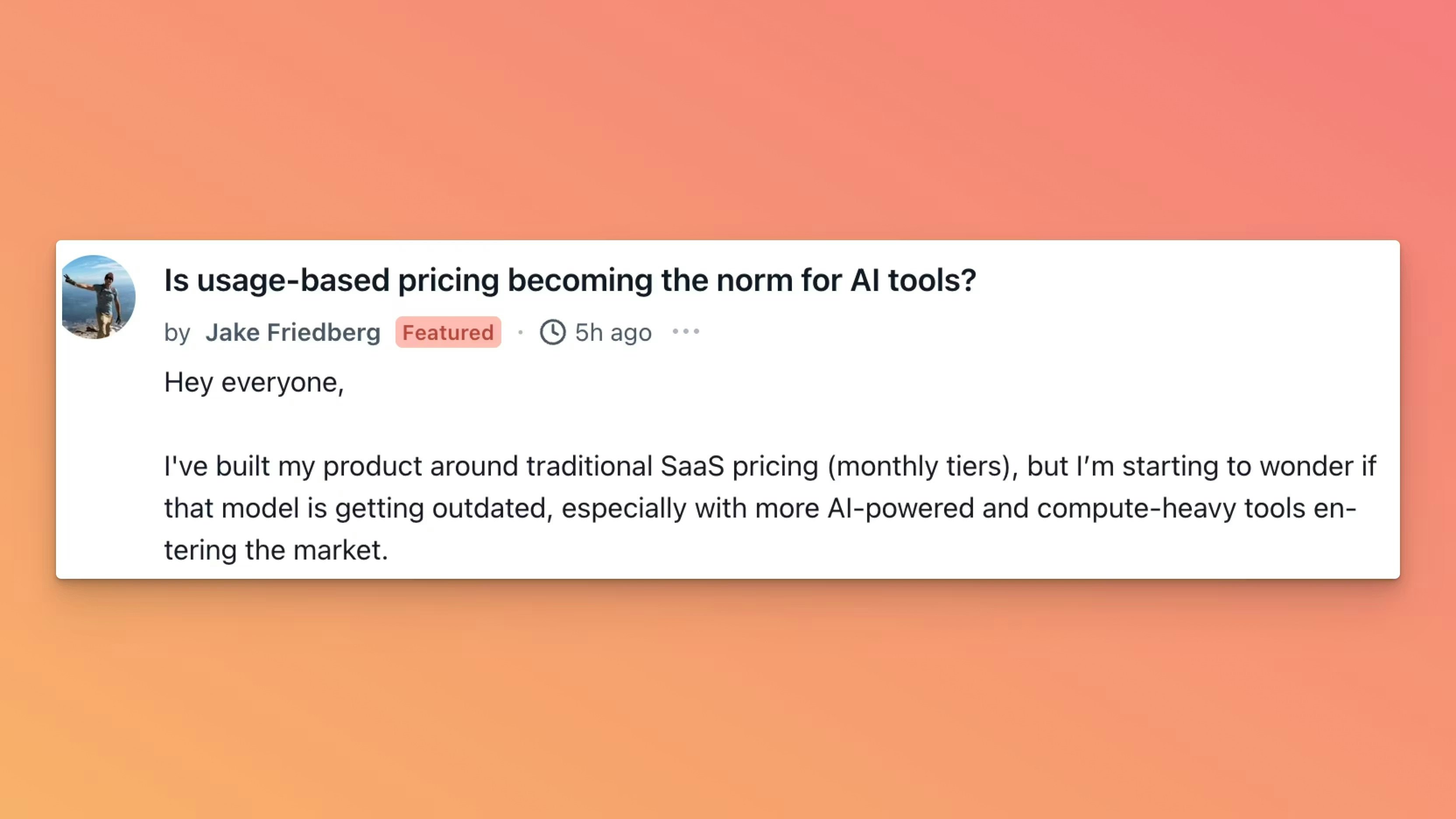 AI tools might be new, but Jake Friedberg does things the old-fashioned way: SaaS pricing with monthly tiers. But since āevery prompt costs money,ā heās now seeing some AI platforms charge based on use. Whatās the way forward?