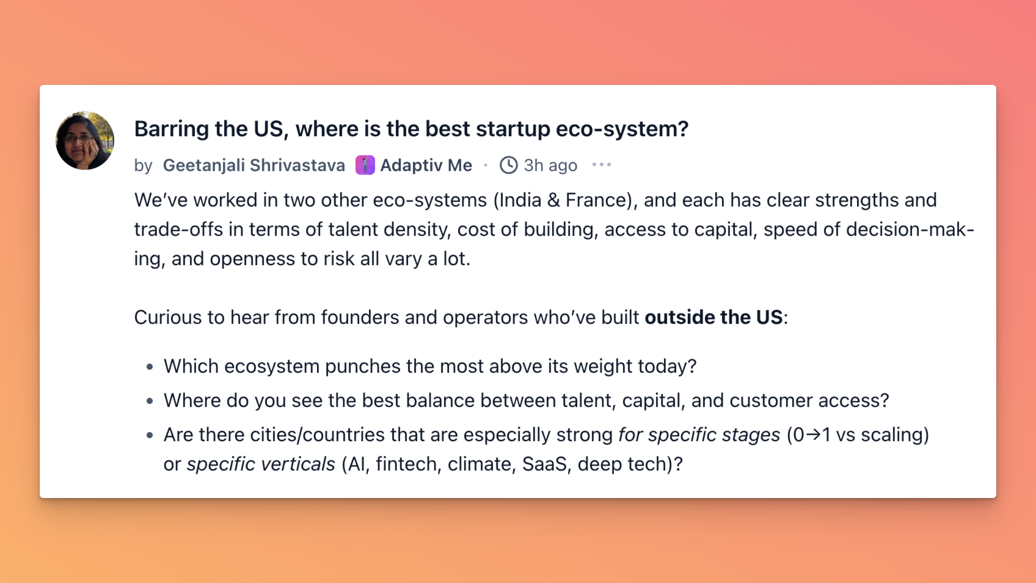 Geetanjali opened a thread asking founders and operators to zoom out from the usual “Silicon Valley or bust” debate and talk about where the strongest startup ecosystems are outside the US.