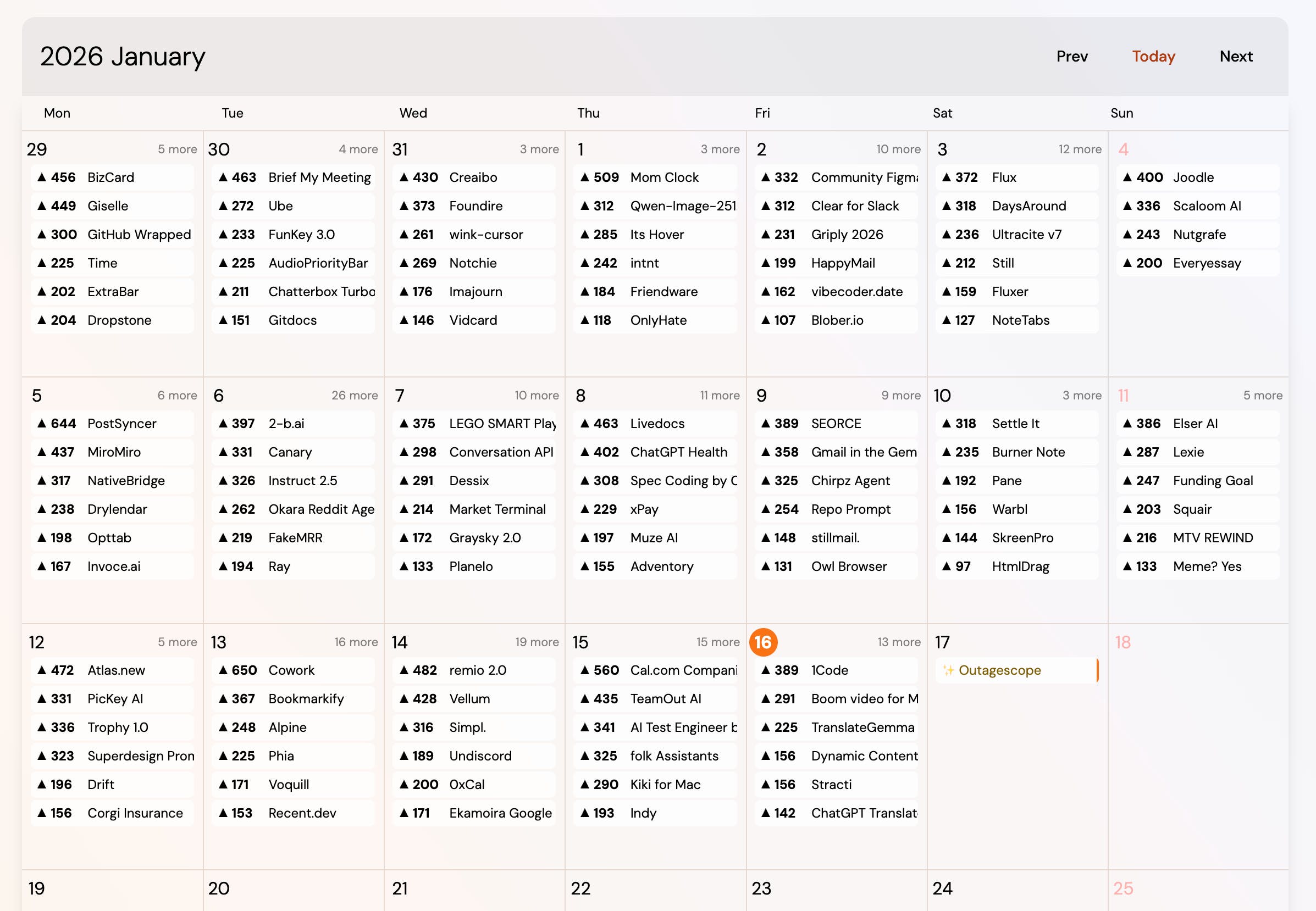 @mikekerzhner I use the Calendar view on Hunted Space as a kind of "heuristics view" to see the trends in number of products featured per day/upvote count thresholds/year-on-year engagement comparisons.