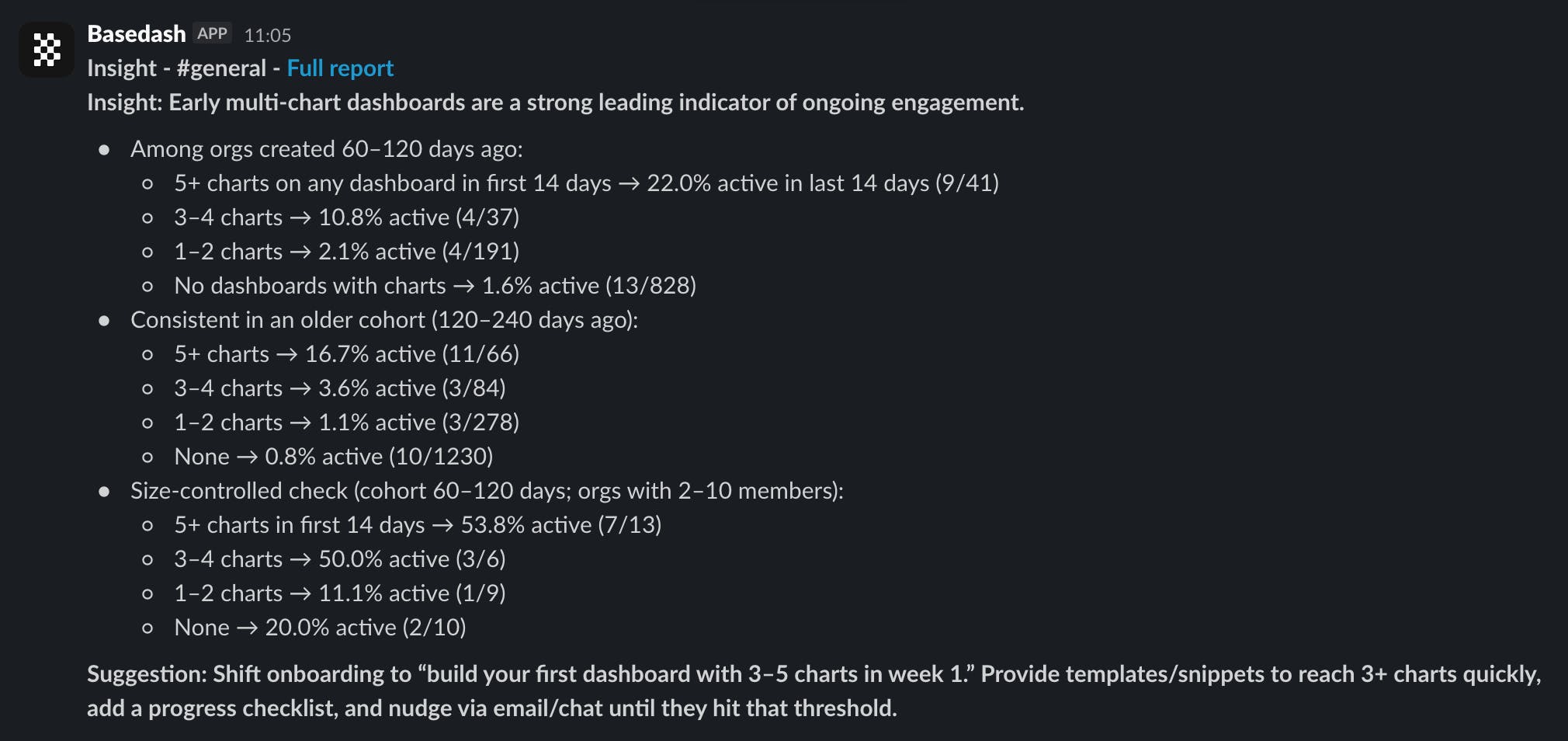 As you can see, the AI discovered a clear correlation between organizations that create multi-chart dashboards early on and long-term product usage. It backed its findings up with stats and gave us an actionable product suggestion to tweak our onboarding flow.