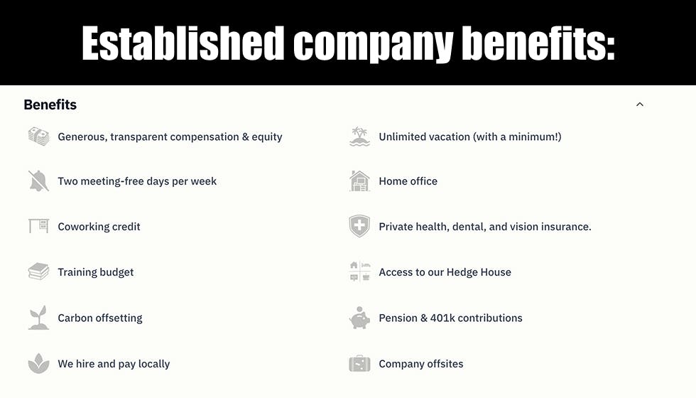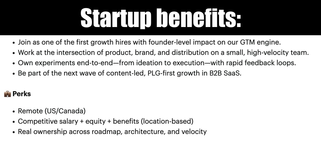 You can see that startups often offer things like “dynamic team,” “remote work,” or “ownership of the strategy” – which don’t really function as benefits, but rather as expectations or situational responsibilities.