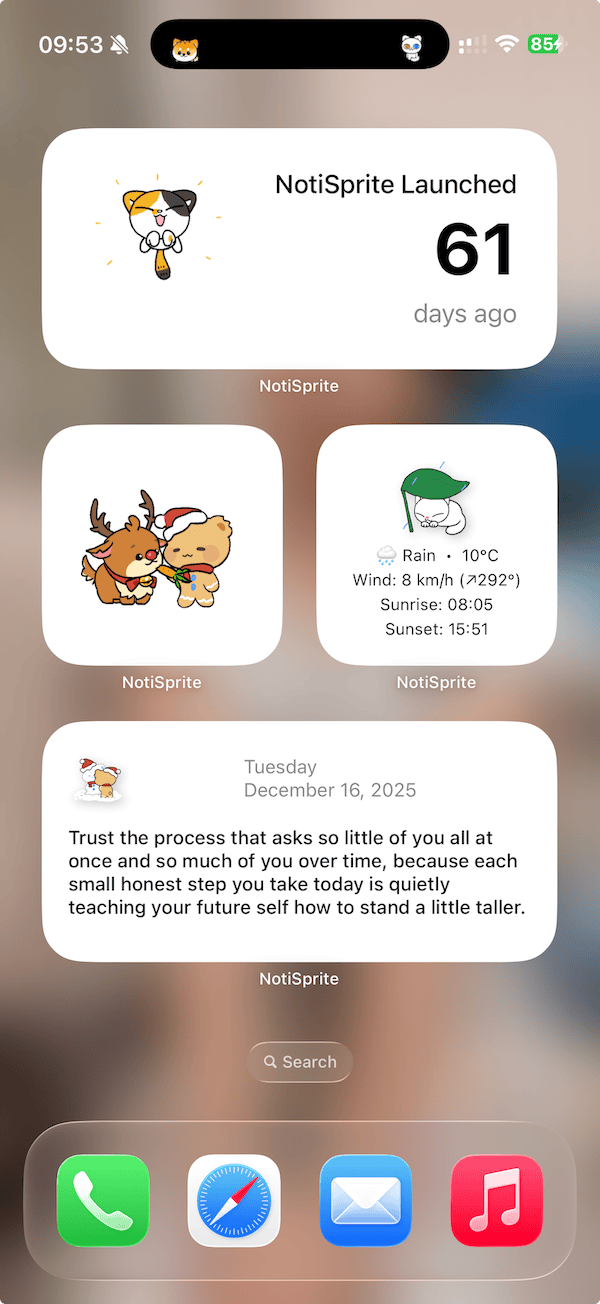 iOS development is very different from macOS. Apps can be suspended or killed by the system, and there is no desktop space for a sprite to wander around. This made the implementation challenging. Instead of copying the macOS experience, I designed NotiSprite for iOS around what the platform does best, using Live Activities, Widgets, and Notifications to keep the sprite present and useful.
