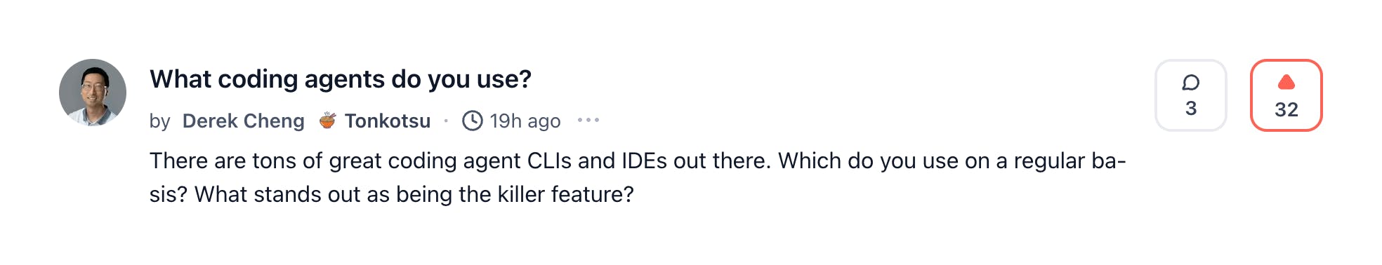 Another week, another survey. Last week, we highlighted a discussion on AI coding models. To keep the conversation going, @derekattonkotsu started a new poll: What coding agents do you use? CLI or IDE? @Claude Code and @Cursor are currently in the lead.