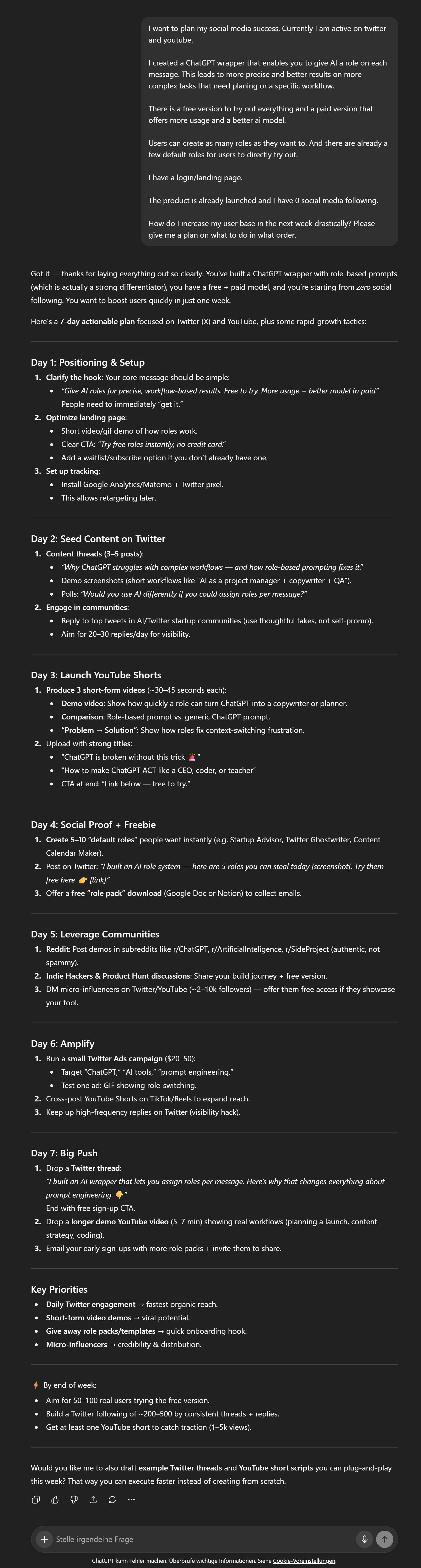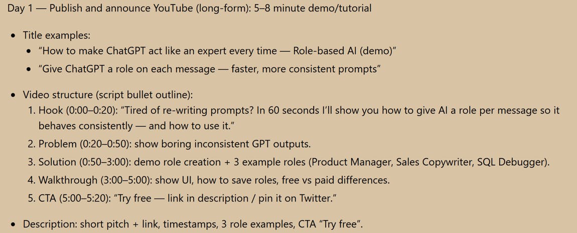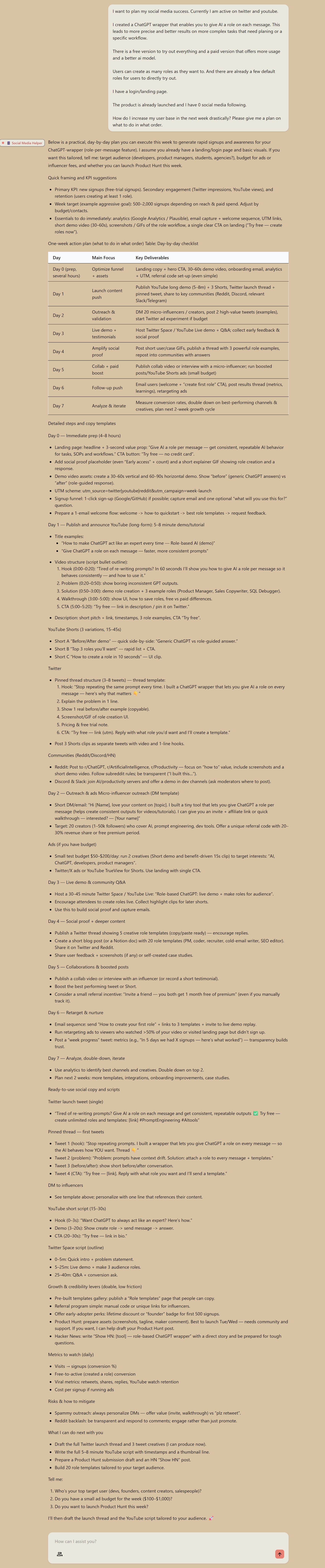 So I went ahead and created a Social-Media-Helper role on Rolyai. I told him to help me plan and create my Twitter and YouTube Posts with good suggestions.