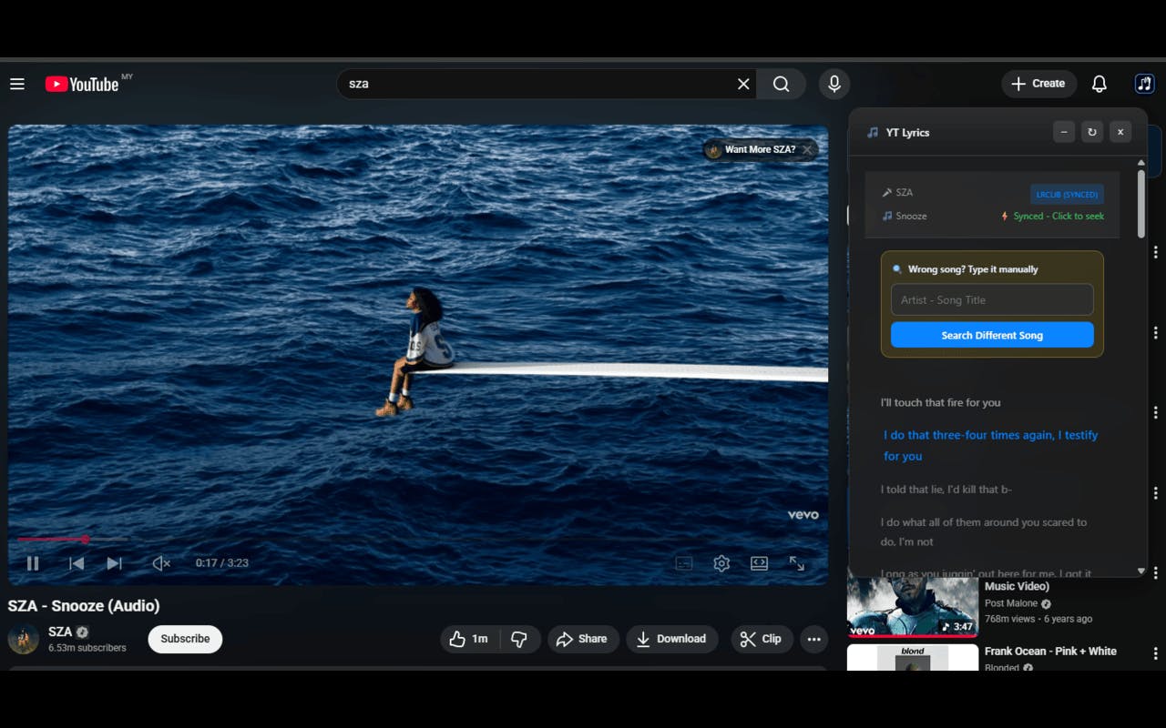 I listen to a lot of music on YouTube, but switching tabs to look up lyrics always ruins the flow.