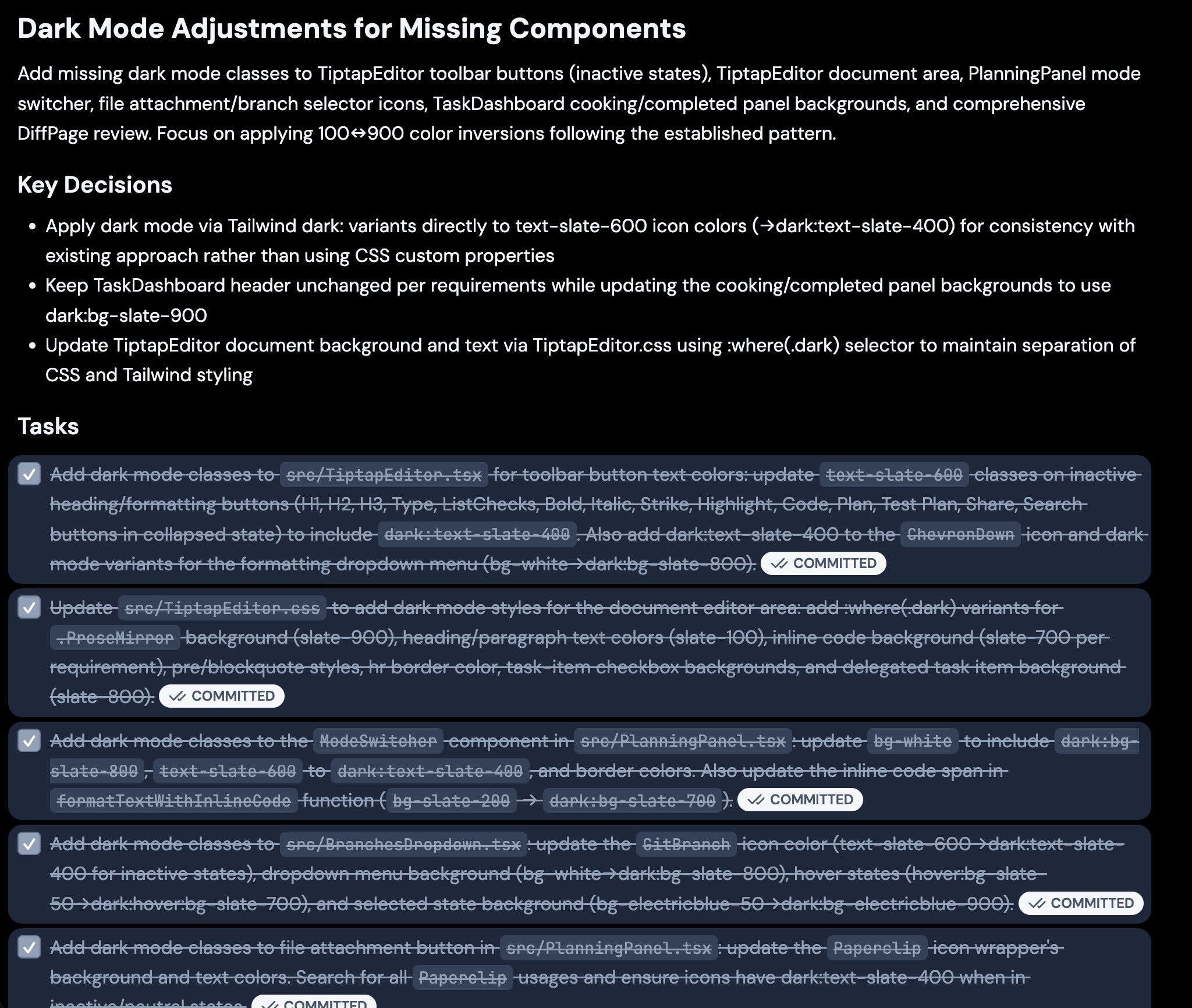 I started with Tonkotsu's planning agent and asked it to look at our frontend repo and formulate a plan for dark mode. I gave it general dark mode visual design guidance on selection of colors that our designer Sam formulated.