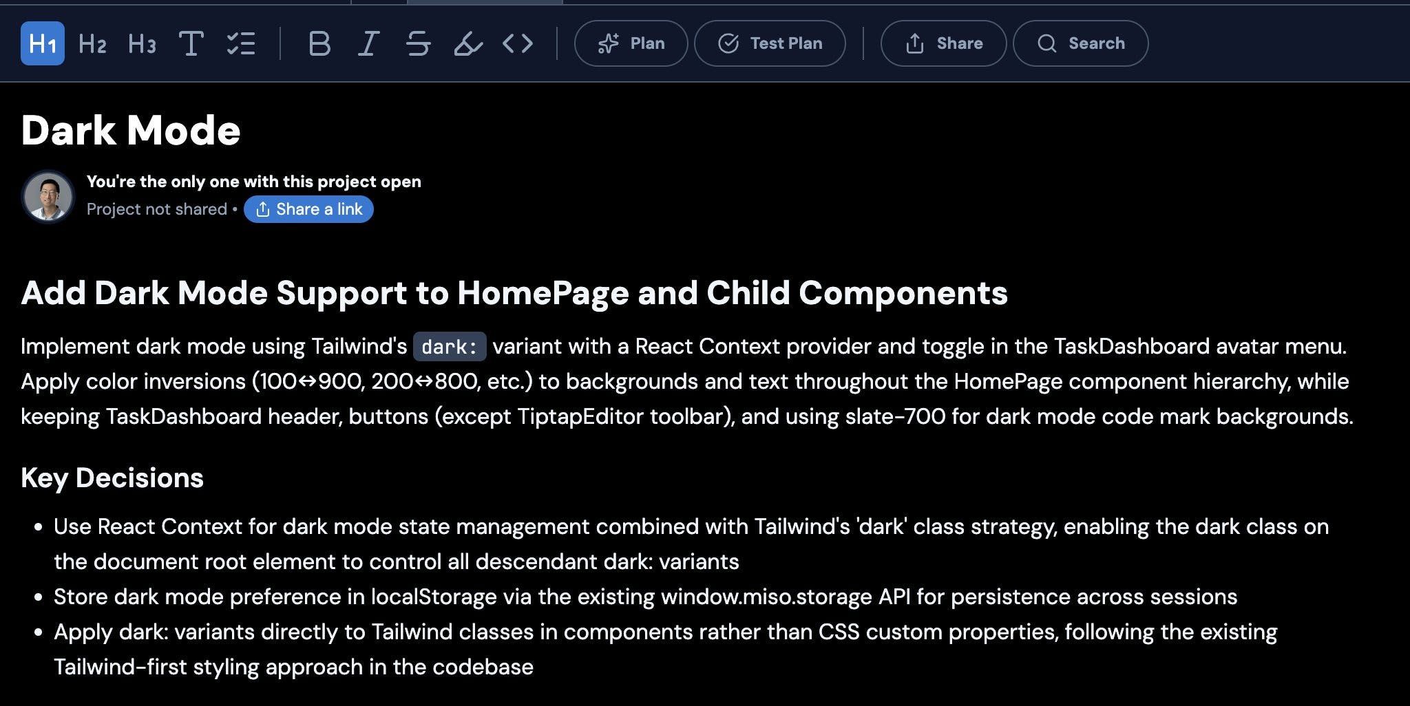 Tonkotsu researched our repo and proposed a plan, covering key decisions like where to store preferences, and how to propagate the setting throughout. I reviewed and gave feedback to cover a case the multi-window case, where the user may change the dark mode setting in one window and it should propagate to all other windows immediately.