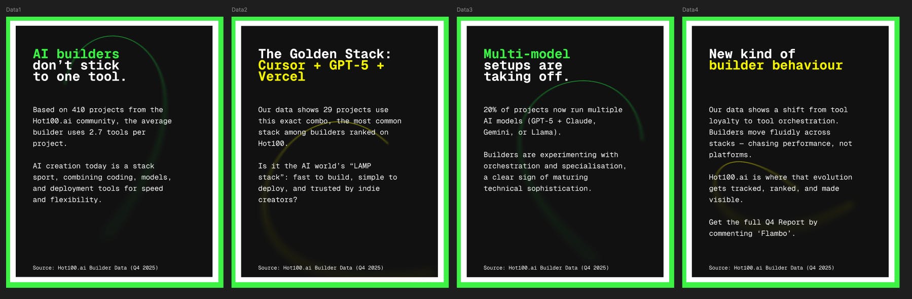 Hey @fmerian , enjoying the thread and thanks for sharing that report, really enjoying the data (and nicely designed ') Last week I launched @Hot100.ai here and have been starting to compile some data analysis from our base (I'll pop that here also) Currently have +450 Vibe Coded projects in there and starting to see some patterns and story about tooling, trend and purpose. I'm seeing some similarity in the location data set across ours and V0 was a tool that I highlight in the 'Golden Stack'.