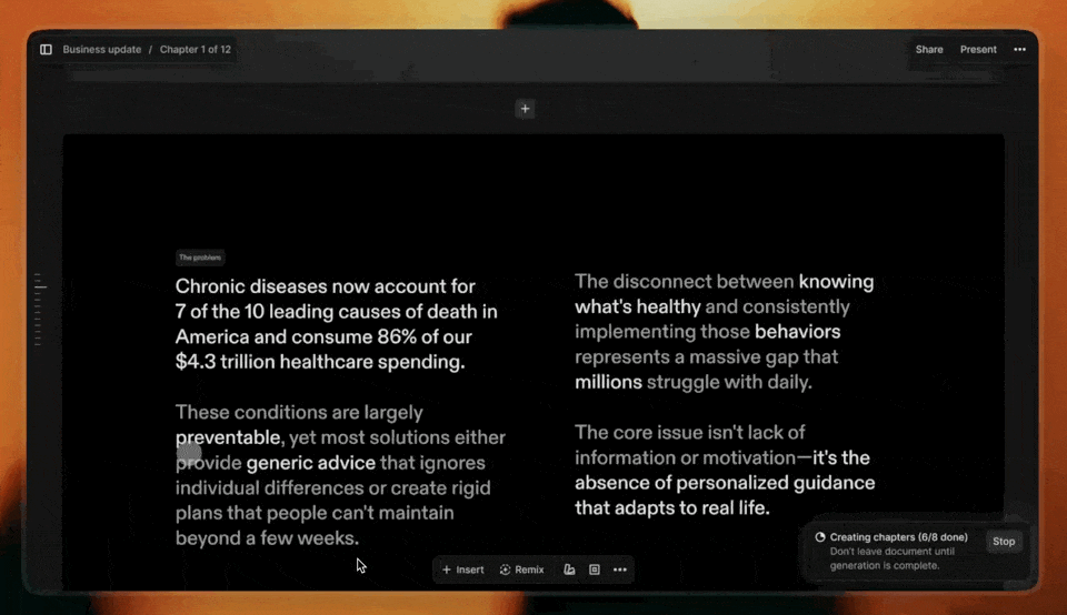 Chronicle combines AI with taste to help you go from raw thoughts to polished presentations. Designed for serious work: Start with templates, create with AI workflows, and collaborate with your team to shape your ideas into impactful narratives.