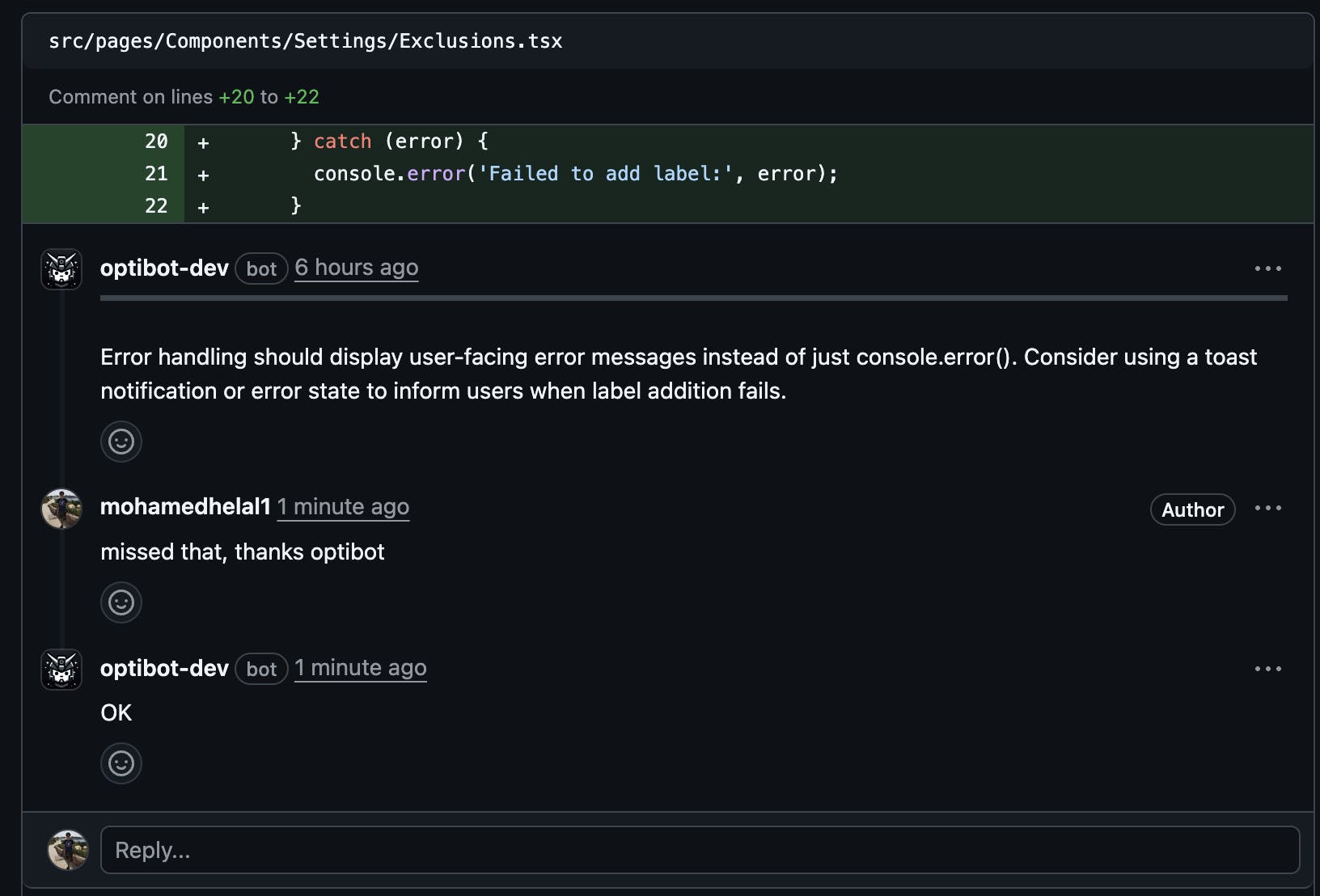 We built Optibot to 'think before it speaks' — it starts by deeply understanding the code, then asks clarifying questions, and finally gives precise, actionable feedback. Compared to the usual noisy pattern matchers, it really feels like adding a thoughtful senior engineer to every PR. Excited for everyone to try it out!