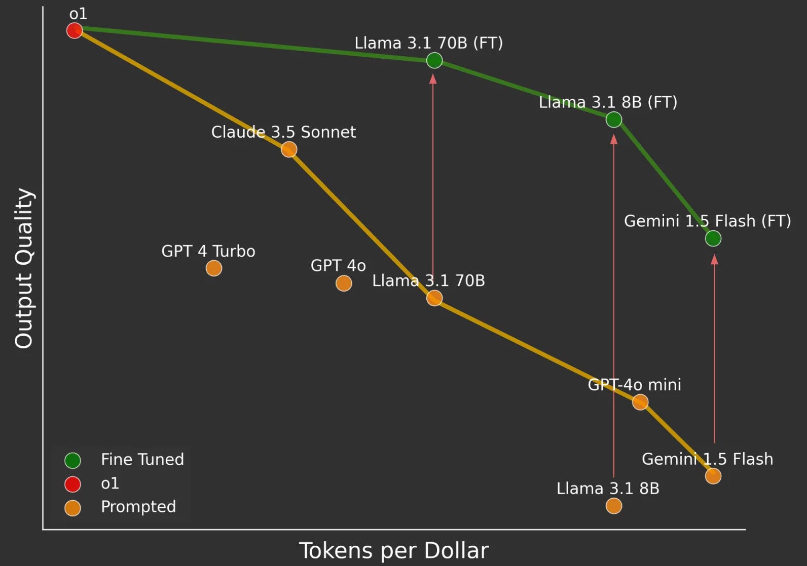 This effect is well illustrated on the graph below. The cost vs quality Pareto frontier for fine-tuned models is significantly more attractive than the one for prompted models alone.